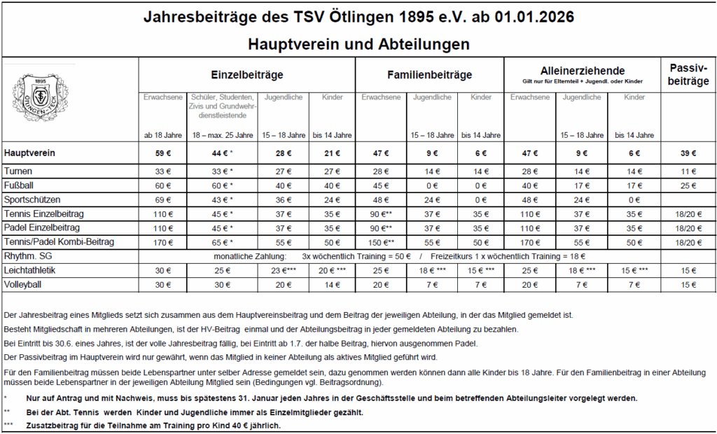 Der Jahresbeitrag eines Mitglieds setzt sich zusammen aus dem Hauptvereinsbeitrag und dem Beitrag der jeweiligen Abteilung, in der das Mitglied gemeldet ist.